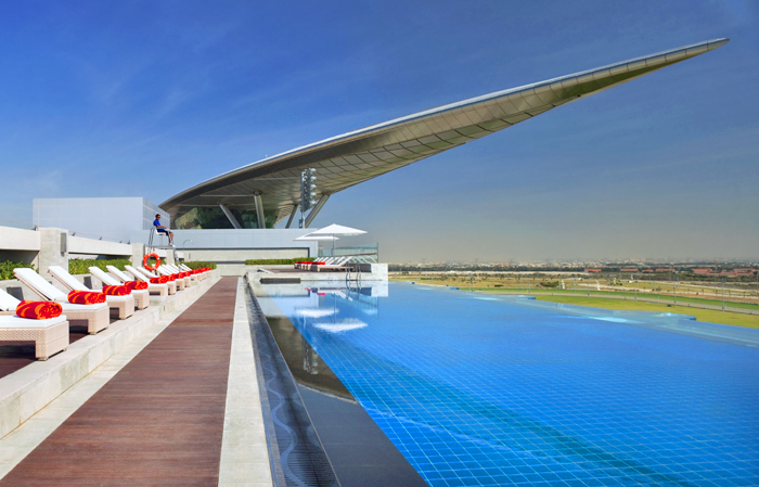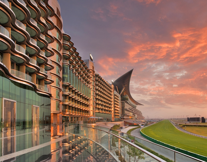 Первый в мире отель при конно-спортивном комплексе открыт в Дубаи в 2009 году. Для истинных любителей захватывающего и красивого зрелища – конных состязаний. Здание отеля протянулось на 1,6 км. и разместило 284 просторных, богато и экстравагантно оформленных номеров и сьютов ( все номера, за исключением номеров The Meydan Suites,с видом ипподром, прямо не выходя из номера можно наблюдать за состязаниями).